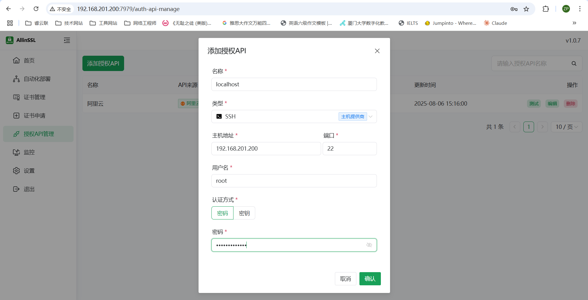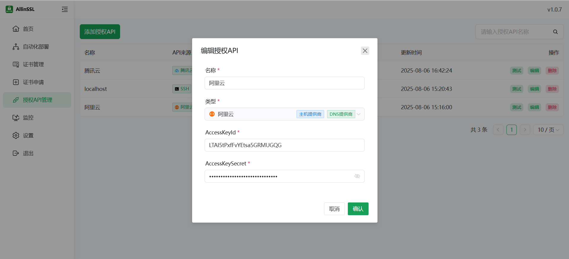 此页面用于管理 ALLinSSL 与其他服务交互所需的凭证和 API 密钥。例如,申请证书时需要 DNS 提供商的 API 密钥进行域名验证,部署证书时可能需要服务器的 SSH 凭证、云平台的 API 密钥或面板的接口密钥。