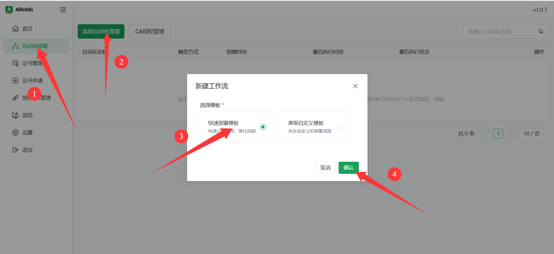 点击【自动化部署】——【添加自动化部署】——选择【快速部署模板】——确认