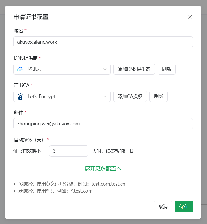 - 广泛兼容: 支持 Let’s Encrypt 等免费 CA,兼容多种 DNS 提供商、云服务商(腾讯云、阿里云等)、服务器部署方式(SSH、宝塔、1Panel)以及 CDN、WAF 等应用。