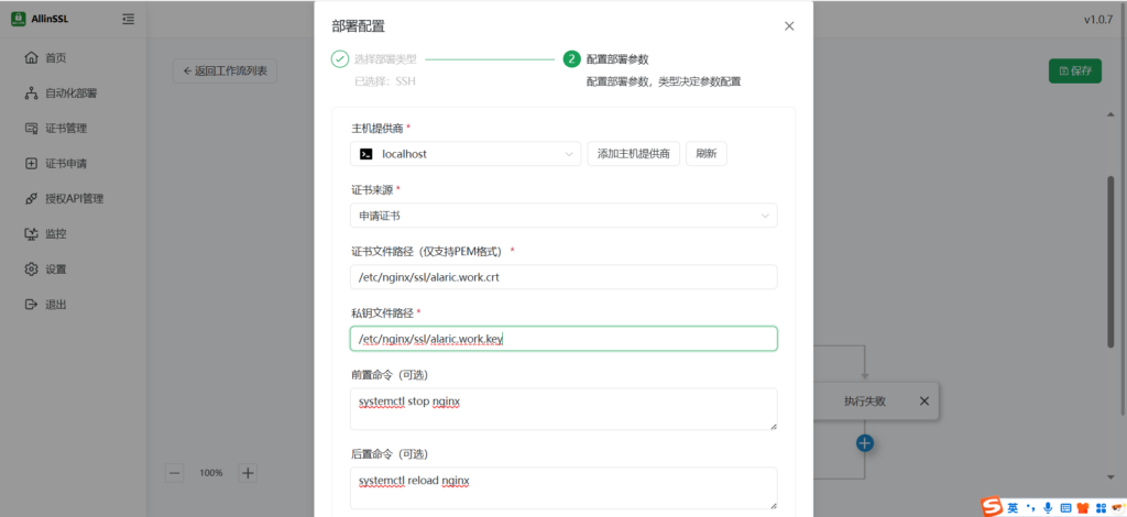 点击【部署】按钮配置将证书部署到服务器上什么位置