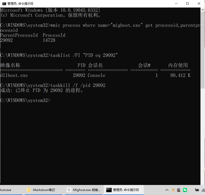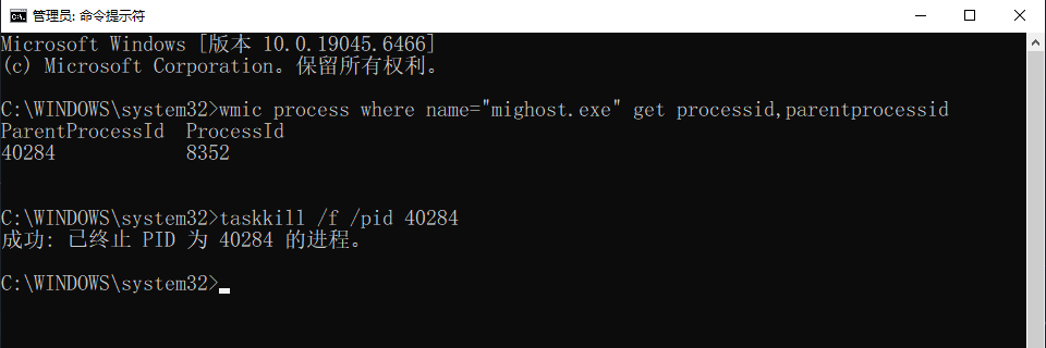 wmic process where name="mighost.exe" get processid,parentprocessid
